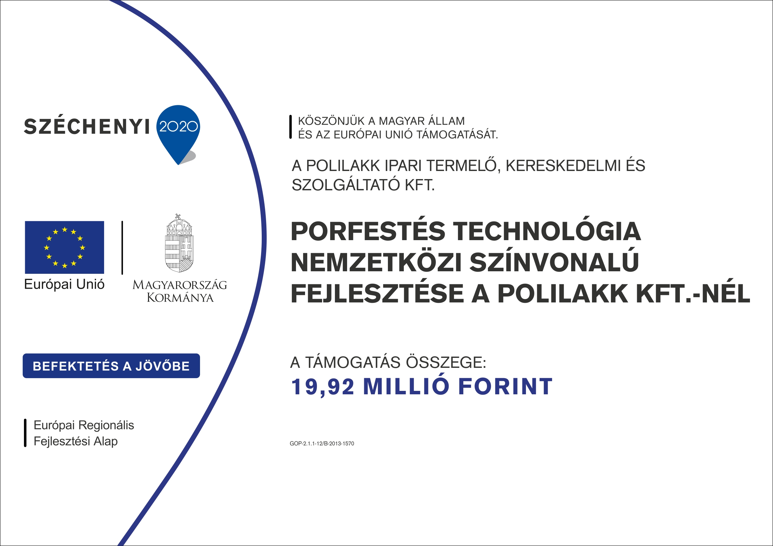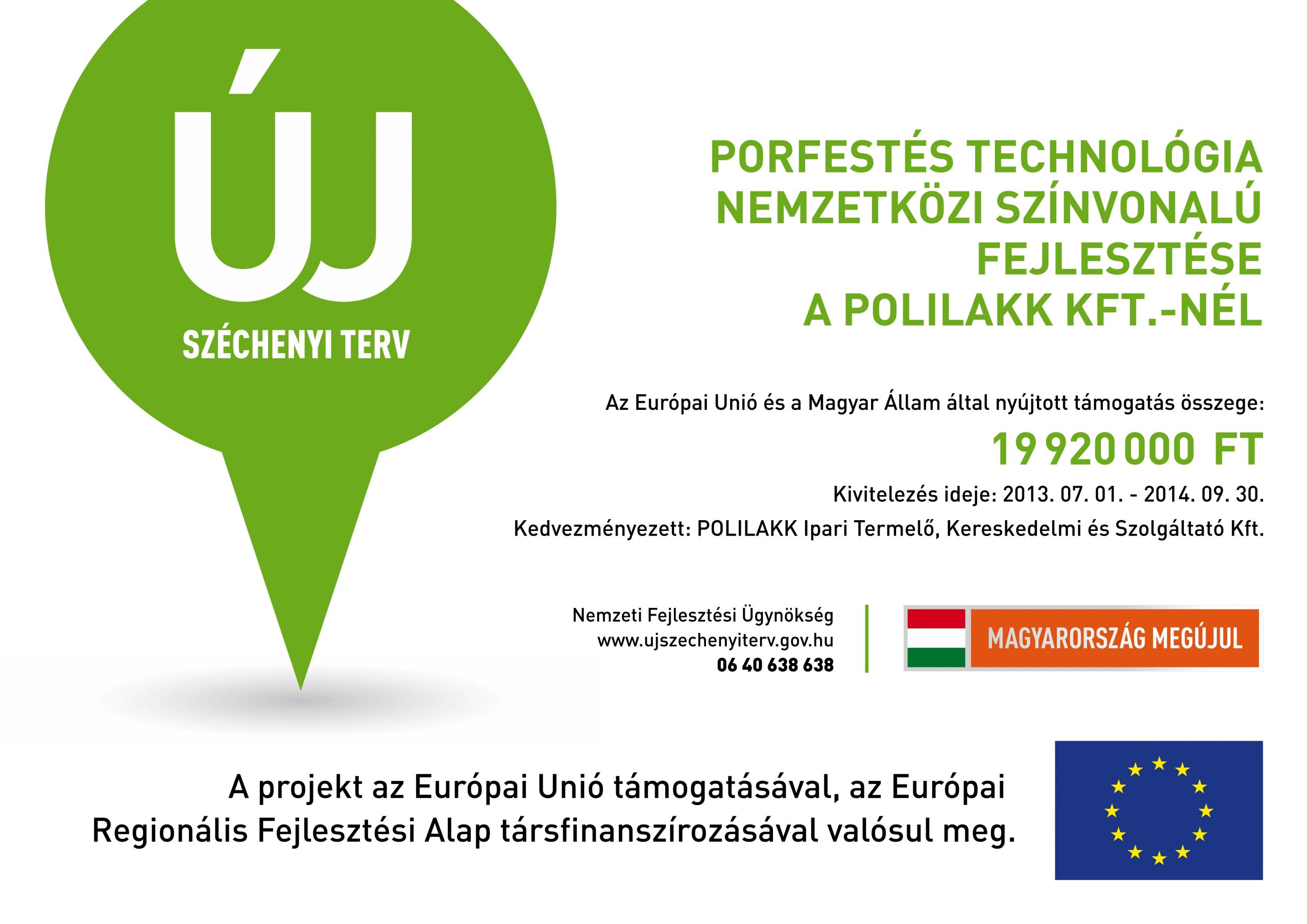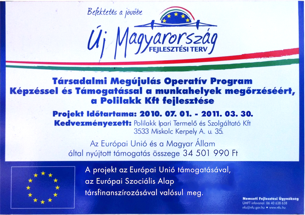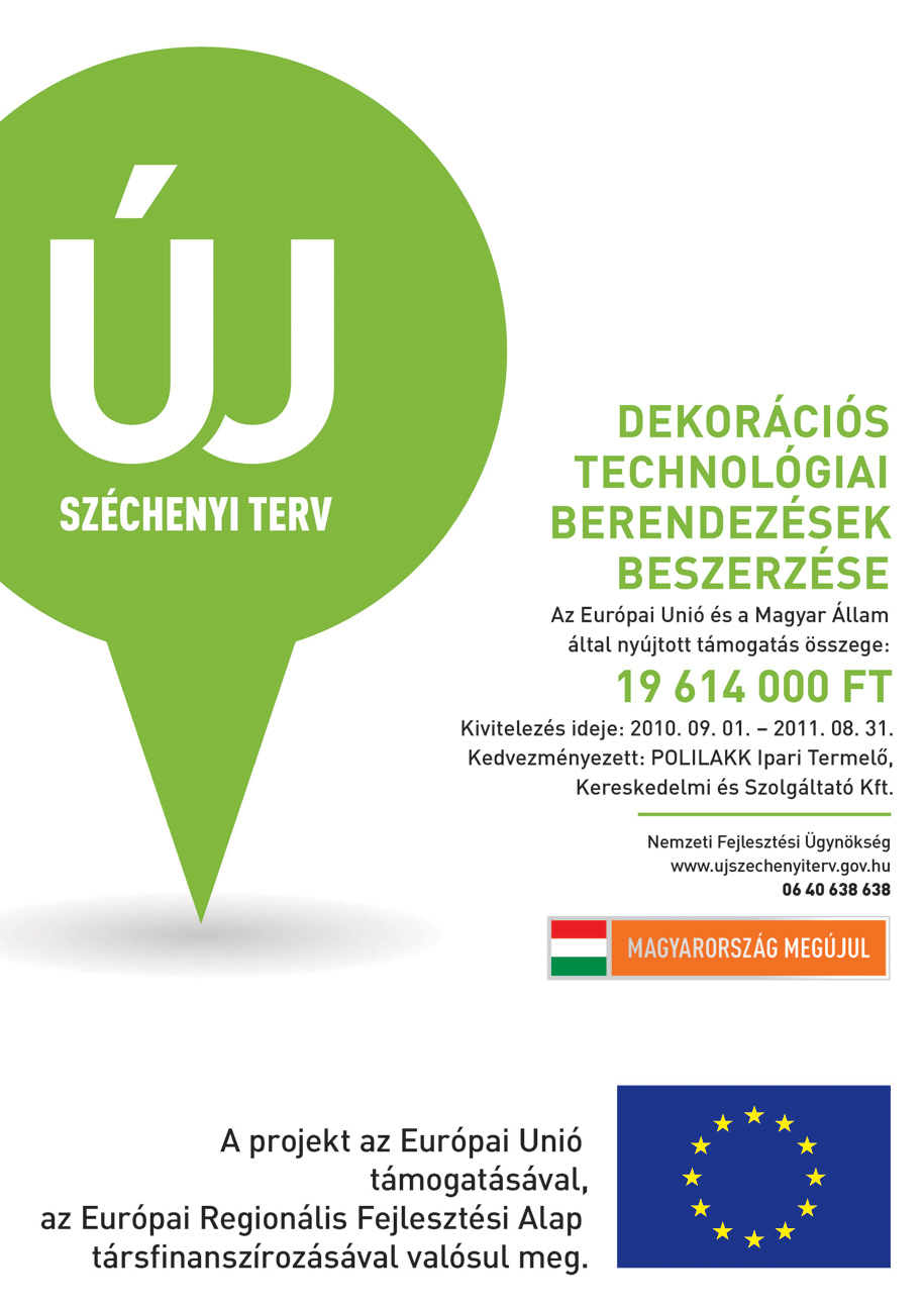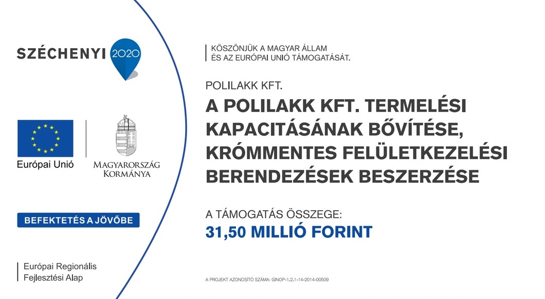 Polilakk Ltd successfully implemented its project titled “Increasing the production capacity of Polilakk Ltd, purchasing chrome-free surface treatment devices” from 2 Feb 2015 to 30 Oct 2015. Polilakk Ltd won HUF 31.5 million non-refundable assistance for the implementation of the project. The project was accomplished with European Union assistance within the framework of the tender GINOP 1.2.1-14-2014.